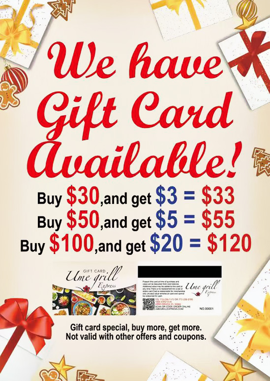 Welcome to Ume Grill Express, your go-to destination for a delicious and vibrant dining experience! Our casual atmosphere is perfect for a quick meal or a relaxed dinner, making it ideal for everyone on the go. With a commitment to fresh ingredients and exceptional service, we’re here to make your visit memorable and enjoyable. Come in and discover why we’re the place to be for flavor-packed meals and great vibes!